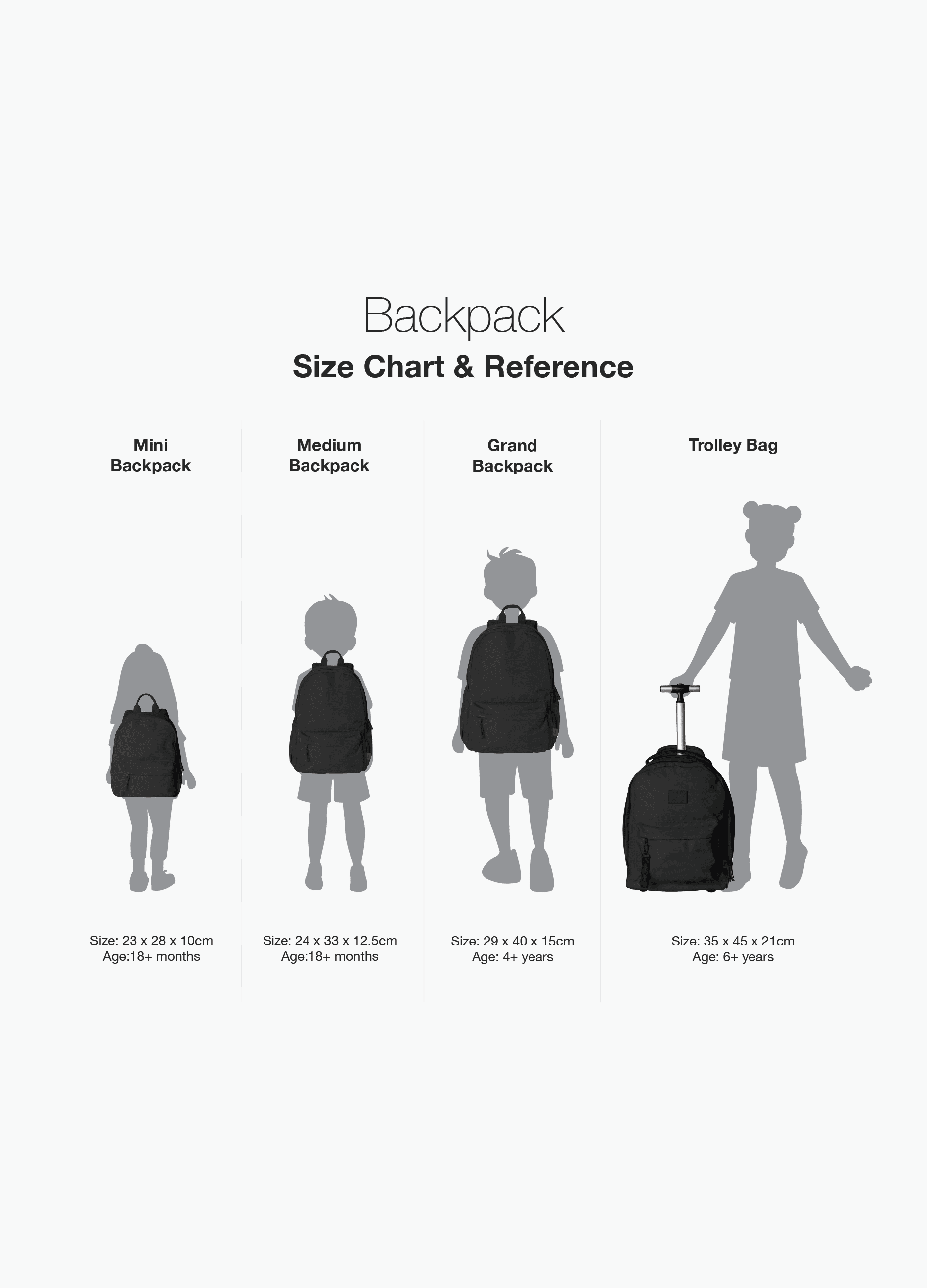 This spacious and light weight Medium Backpack has a main compartment with double-zipper closure and front zipper pocket, so it is perfect for day trips and travelling over the summer for growing kids. It can fit 2 up to 500ml water bottles, 1 Tritan snack box, wet wipes, 1 small sized toy, 1 medium sized toy, kids sunglasses, 1 standard sized toiletry, 1 small clear zipper pouch for accessories, 1 kids storage pouch or IPAD (up to 12.9 inches) and a change of clothes.